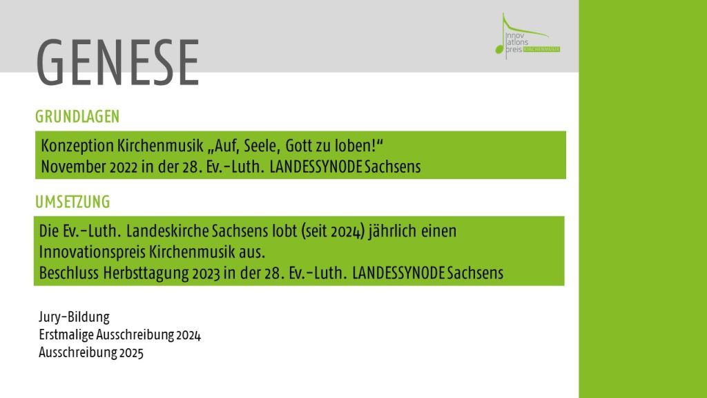 Die Ev.-Luth. Landeskirche Sachsens lobte 2024 erstmals einen Innovationspreis Kirchenmusik zur Förderung von innovativen Projekten aus. Ausgezeichnet werden innovative musikalische Projekte mit einer klar erkennbaren geistlichen Thematik und Ideen, welche geistlich künstlerische Antworten auf gesellschaftlich relevante Fragen geben und nach zeitgemäßen musikalischen Ausdrucksformen des Glaubens suchen. Dieser Preis war auf Grundlage der Konzeption Kirchenmusik durch die 28. Landessynode ins Leben gerufen worden. Der Preis ist mit 5.000 Euro dotiert.