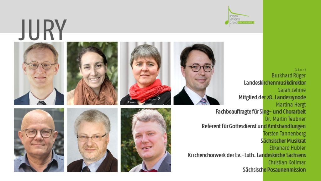 Der Jury gehören neben dem Landeskirchenmusikdirektor, ein Theologe oder eine Theologin, eine Synodale oder ein Synodaler, ein Vertreter des Sächsischen Musikrates und Mitglieder der Konferenz für Kirchenmusik der Ev.-Luth. Landeskirche Sachsens an. Alle Mitglieder der Jury sind unter https://kirchenmusik-sachsen.de/innovationspreis-kirchenmusik/ zu finden.