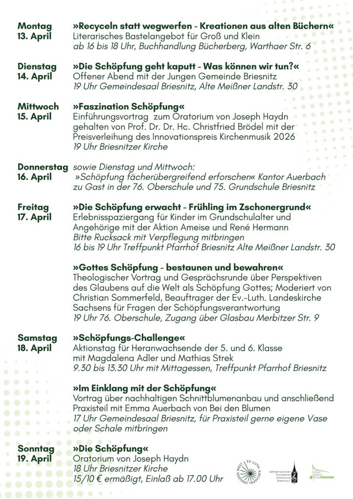 Ausgezeichnet wird das Projekt „Woche der Schöpfung“, die vom 13. bis 16. April im Stadtteil Dresden-Briesnitz stattfindet. Das Projekt mündet in einer Aufführung von Joseph Haydns Oratorium „Die Schöpfung“ in der Briesnitzer Kirche am 19. April 2026